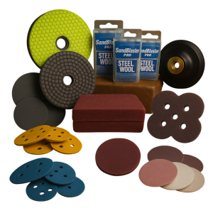 Abrasives: Premium sanding discs, blocks, and sponges for surface refinement.