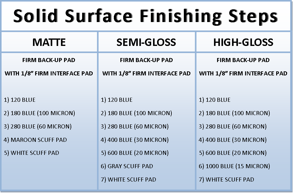 Alternatively, we have adhesive-backed (PSA), hole patterns, and other colors such as gold sandpaper. See the table below for the solid surface finishing steps like matte, semi-gloss, and high-gloss.